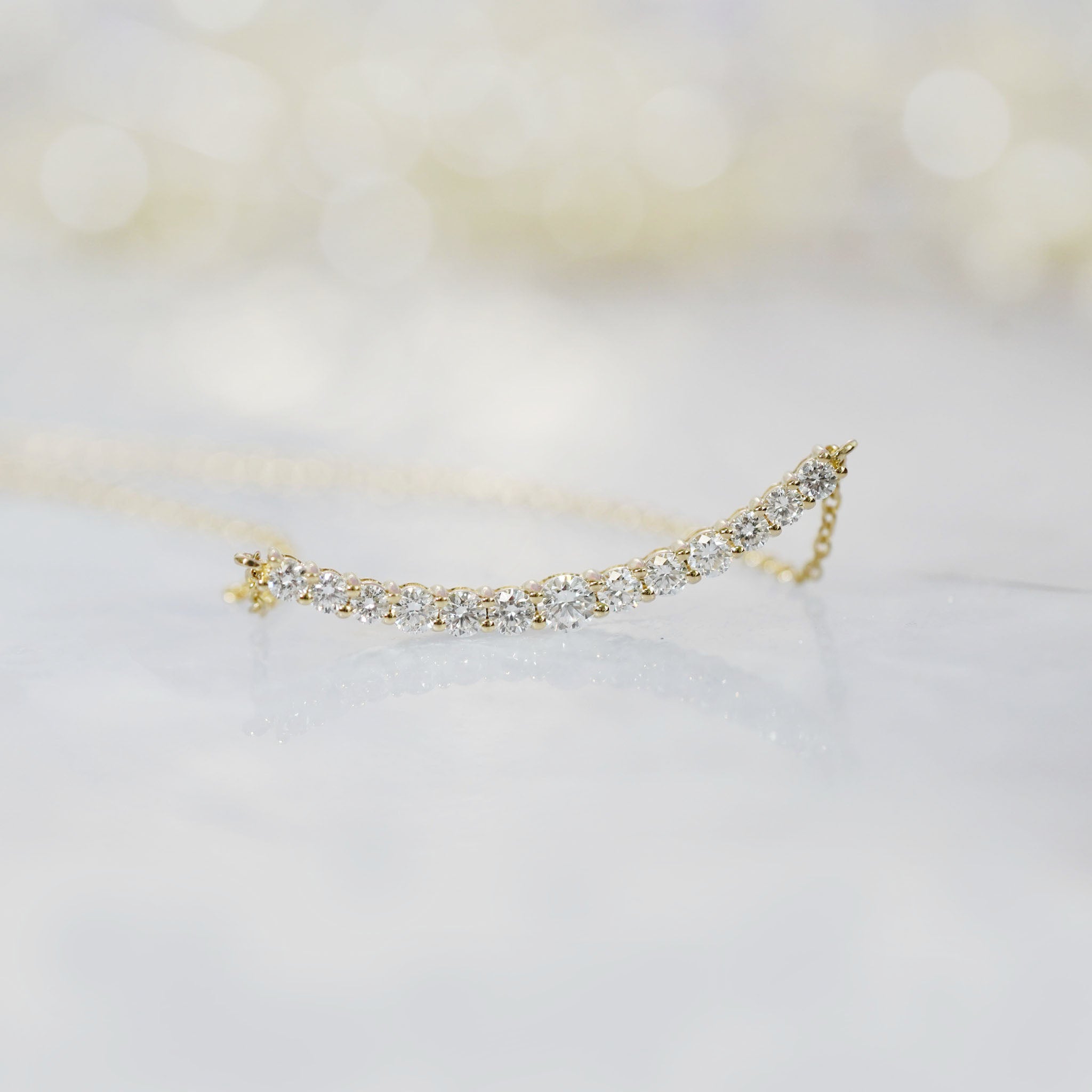 This exquisite 14K white or yellow gold horizontal curved bar pendant features brilliant pave lab-grown diamonds in a classic profile with just enough style to shine. Offering the same sparkle and elegance as mined diamonds but with an eco-friendly and ethical advantage, these .5ctw lab grown diamonds are suspended from a matching 14K gold chain, creating a timeless piece that complements any attire.